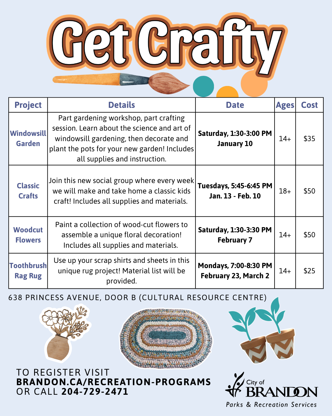Join us for an instructor-led 4-week crochet session where we will be making a crochet basket. This program is on Wednesdays from Jan. 7 to 28, 7 to 8:30 p.m. Crochet experience preferred, but basic knowledge would be acceptable. Takes place at the Cultural Resource Centre (638 Princess Ave., Door B). A material list will […]